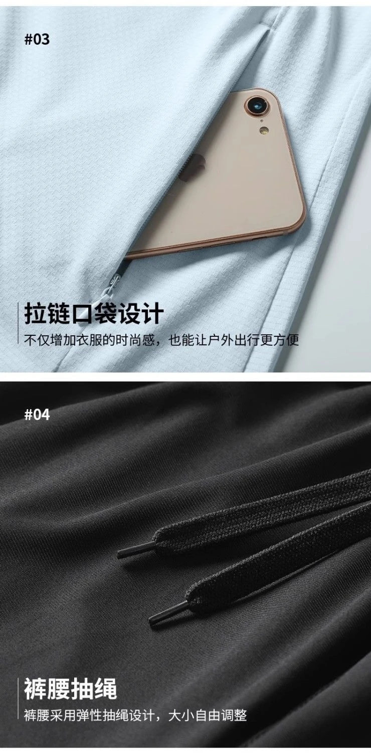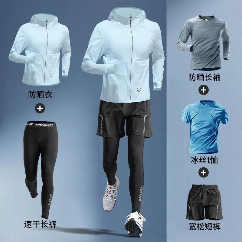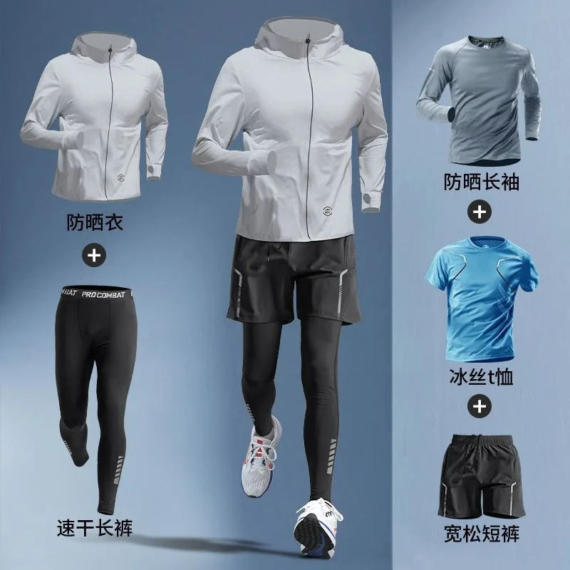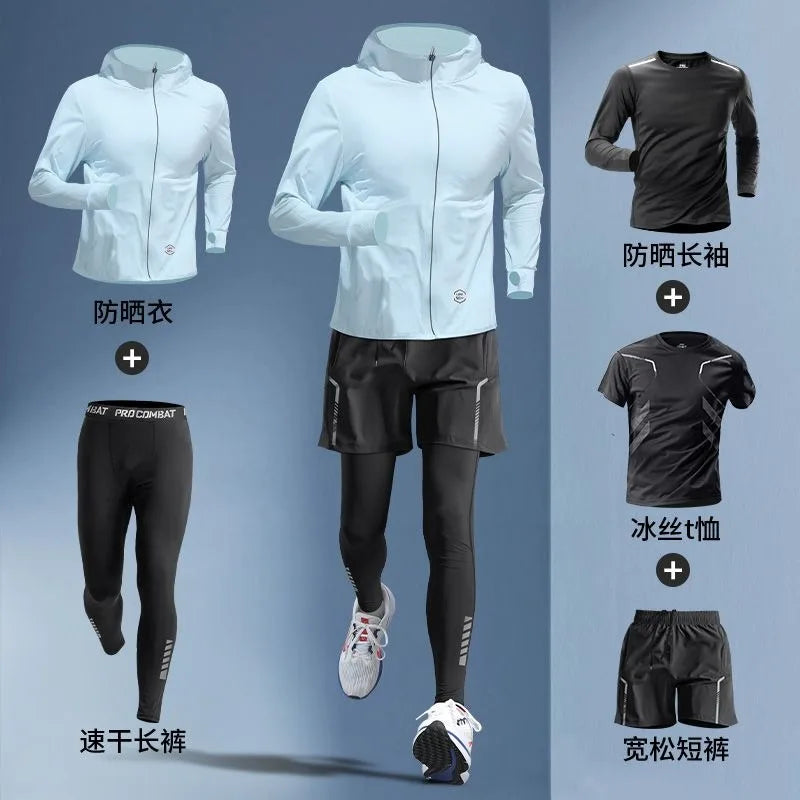 Conjuntos para homens para treino e corrida - material de seda gelada de verão Secagem rápida Resistente aos raios UV Proteção solar para atividades ao ar livre Roupas de qualidade 5 peças